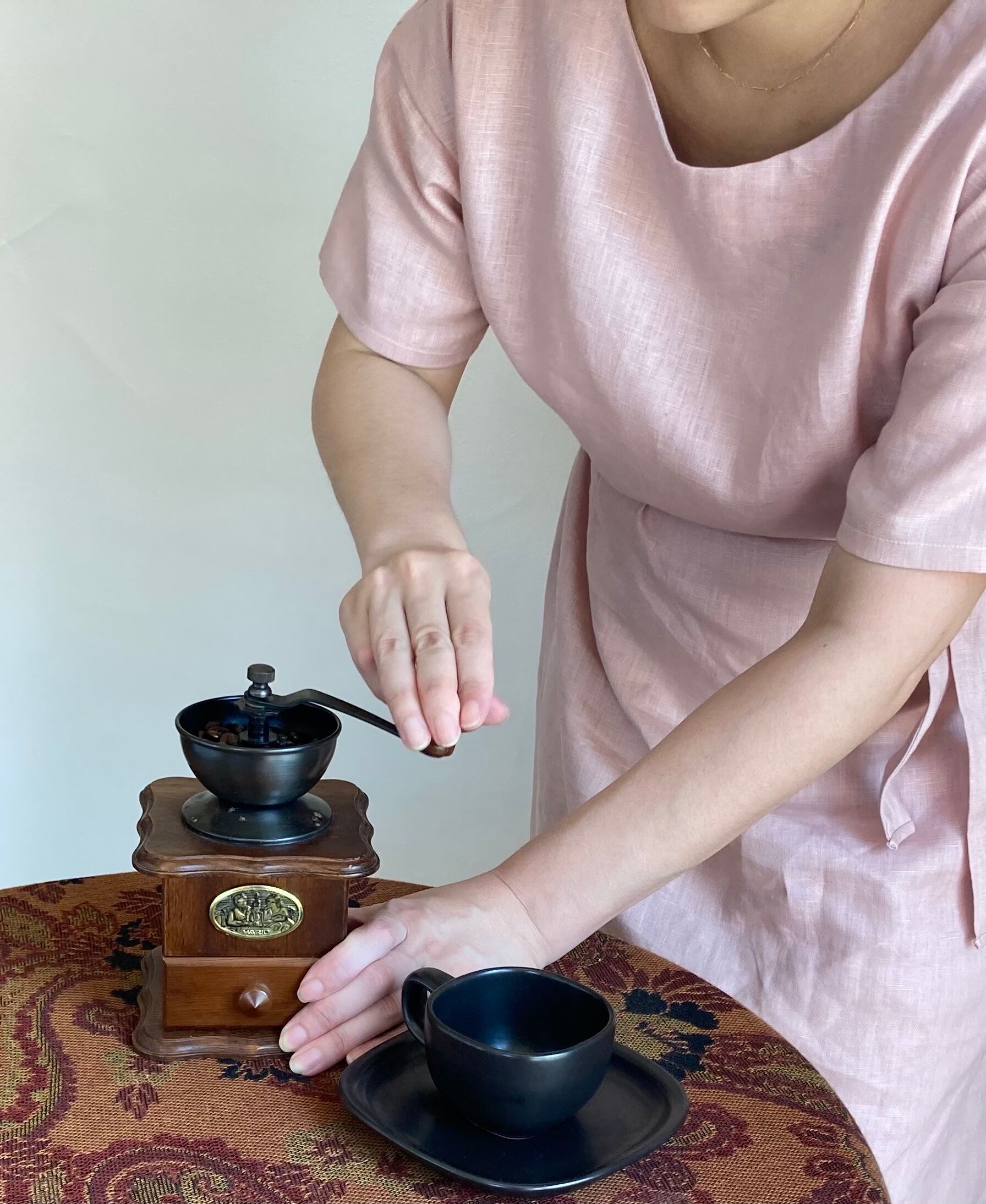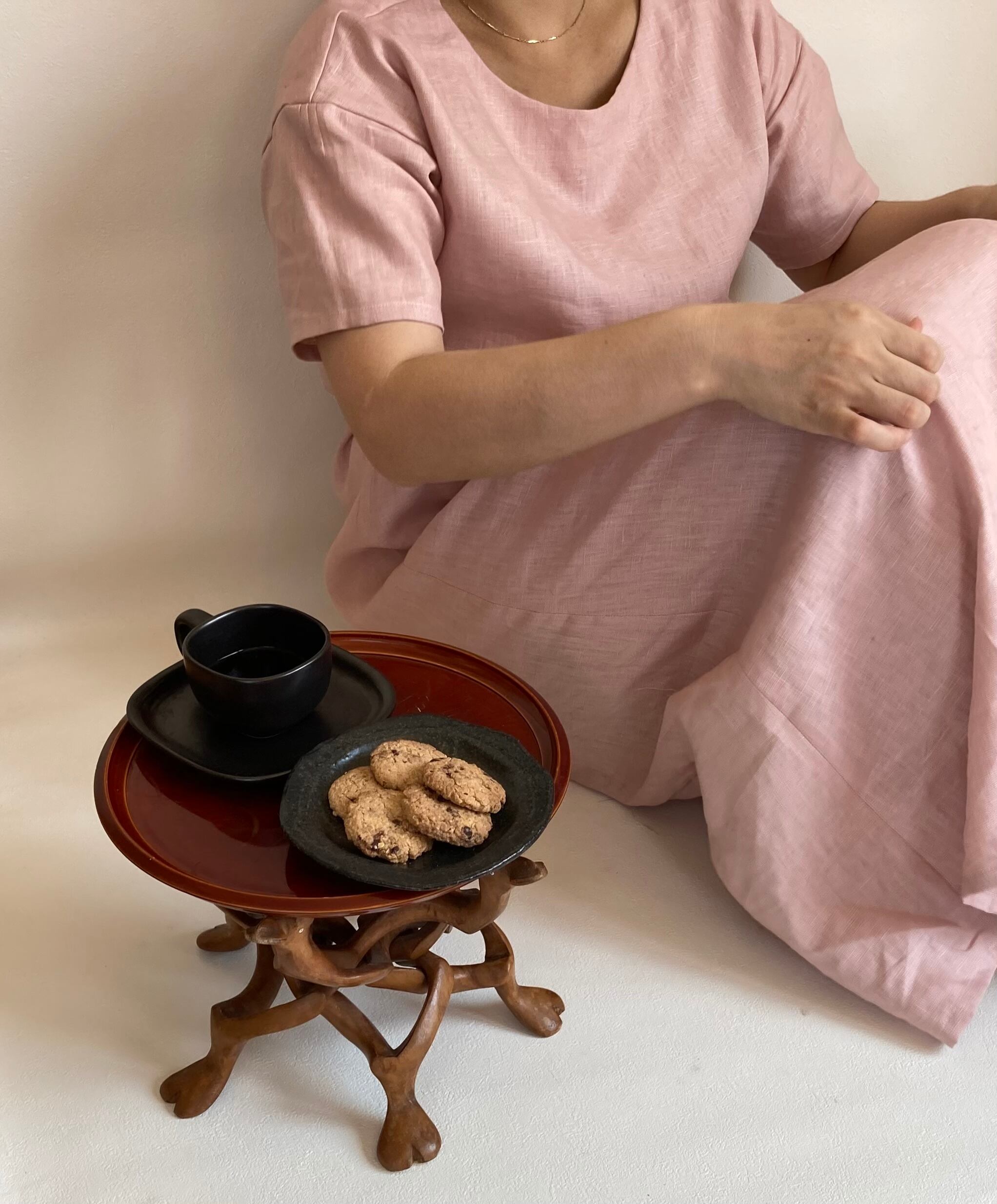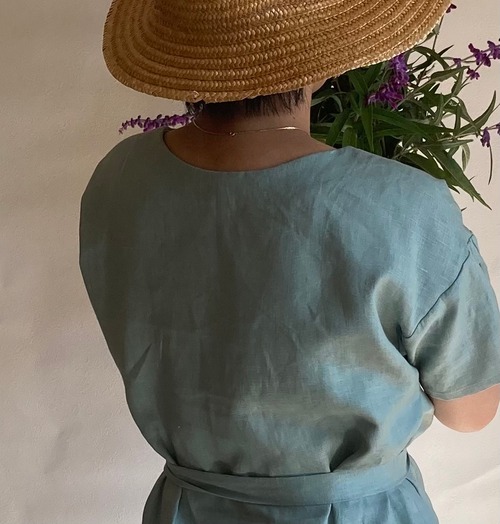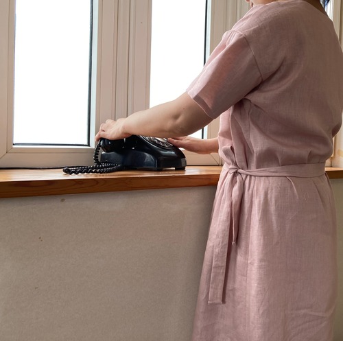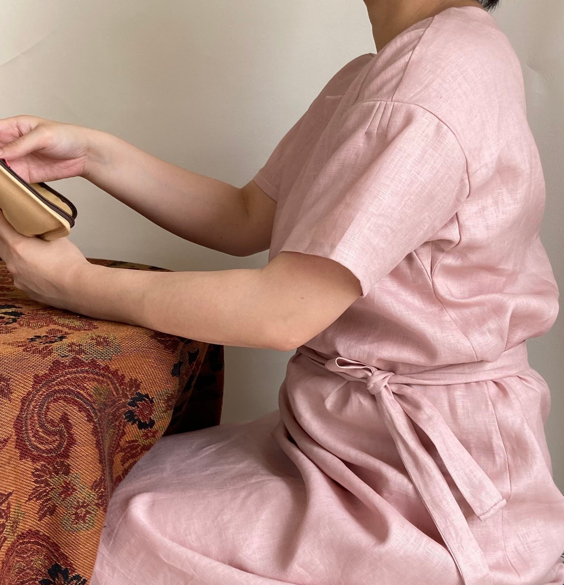 麻/リネン100%涼しいゆったり腰紐ワンピース(ピンク・黄・紺・黒・白/半袖)